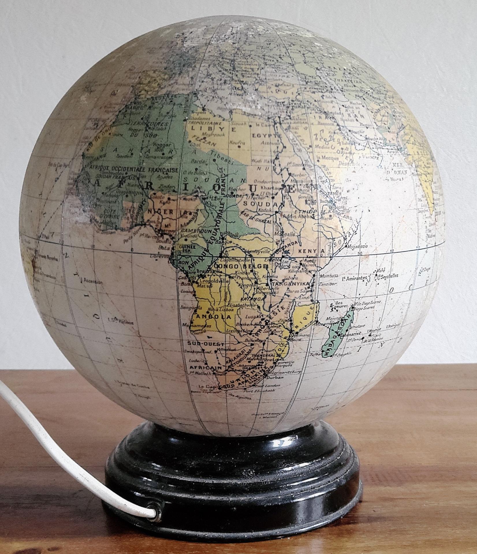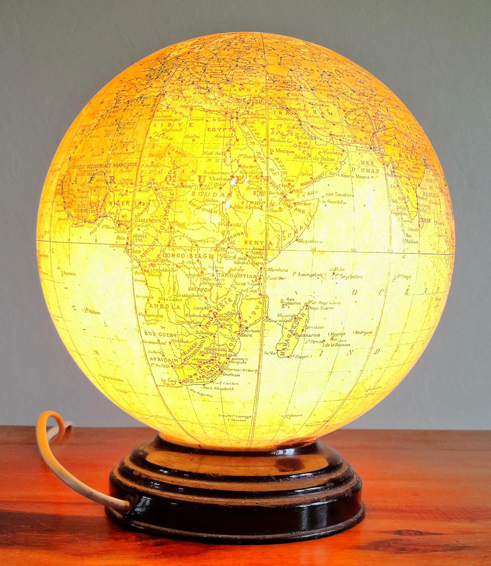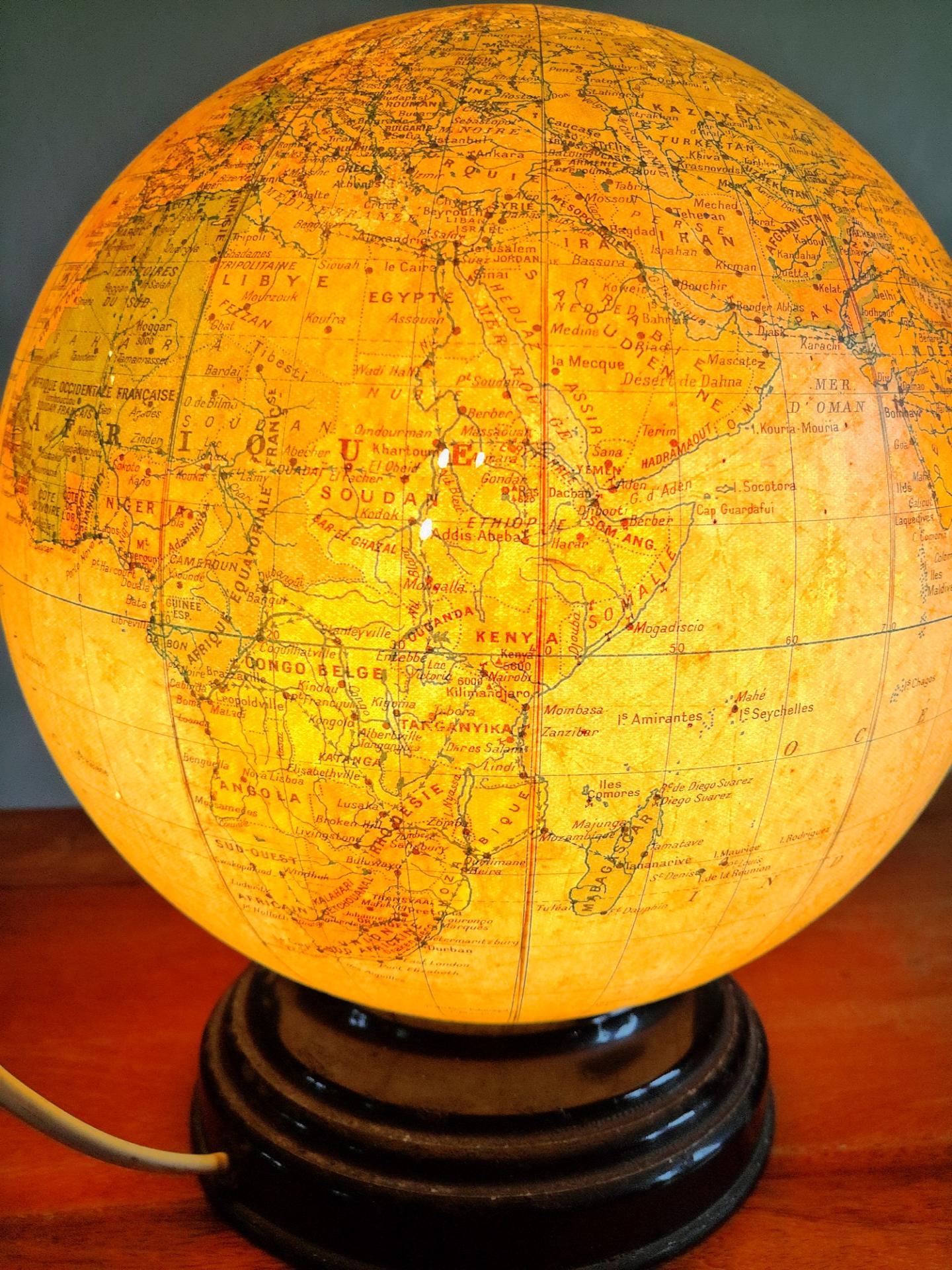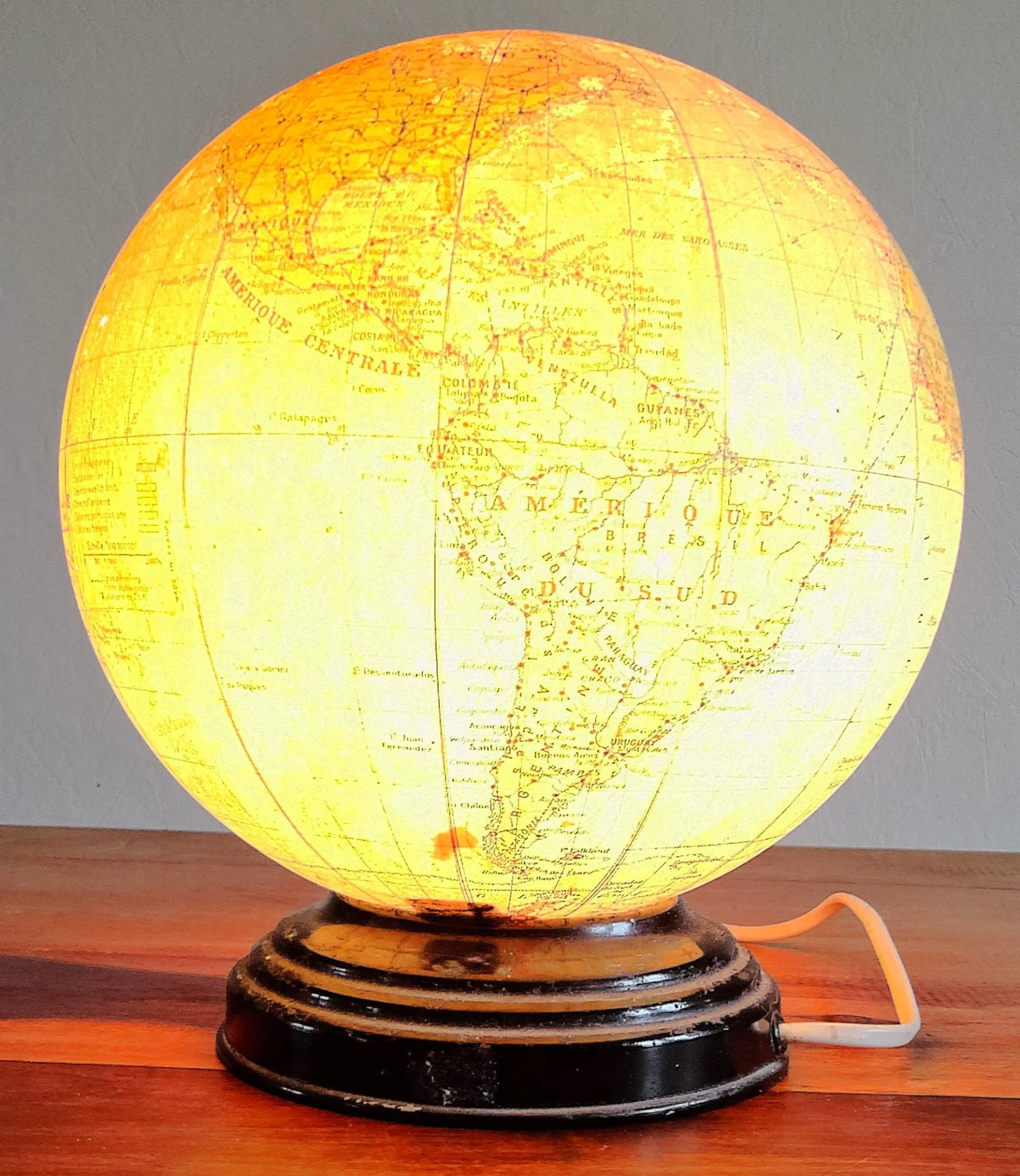 GLOBE TERRESTRE en verre, lumineux, France années 1950