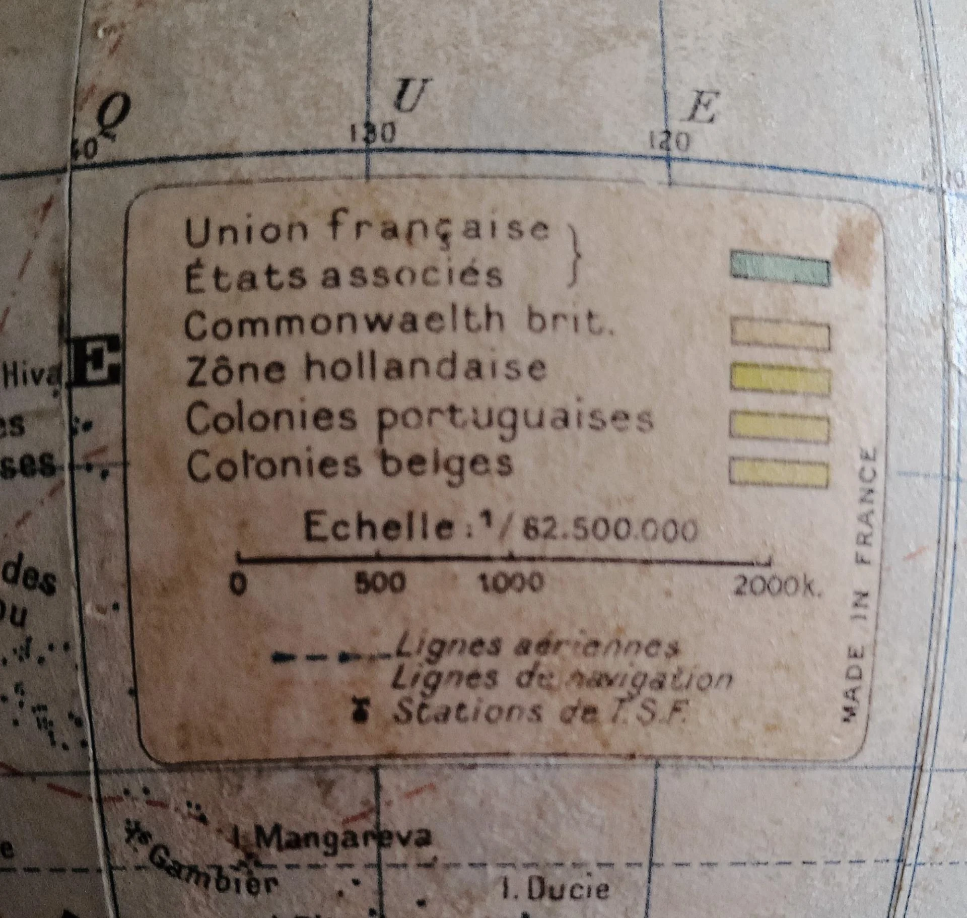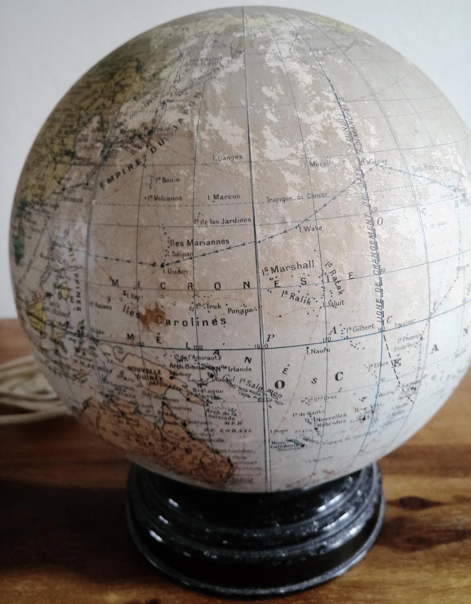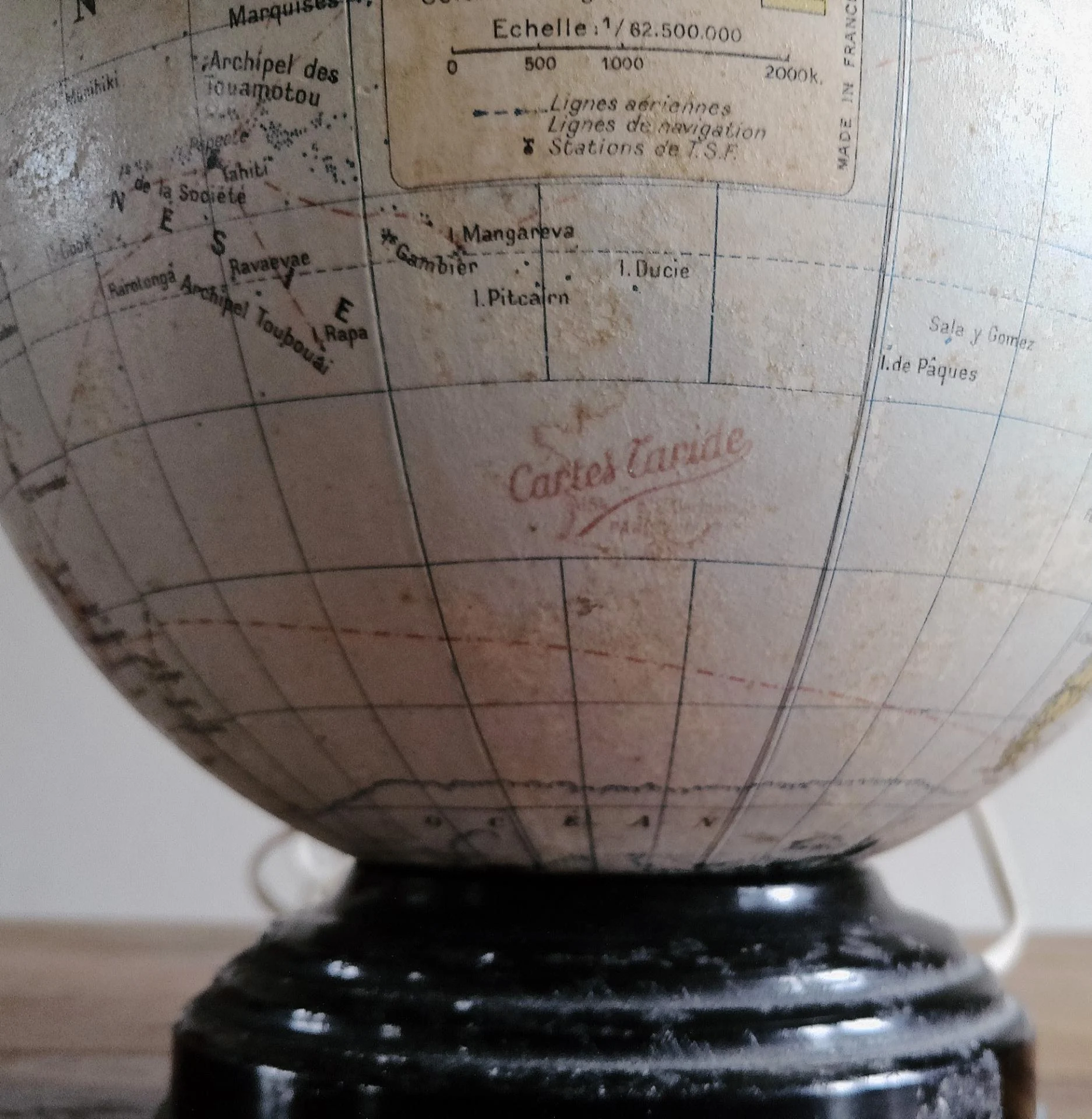 Très joli globe de bureau en verre, lumineux (fonctionne), Taride, France, années 1950.