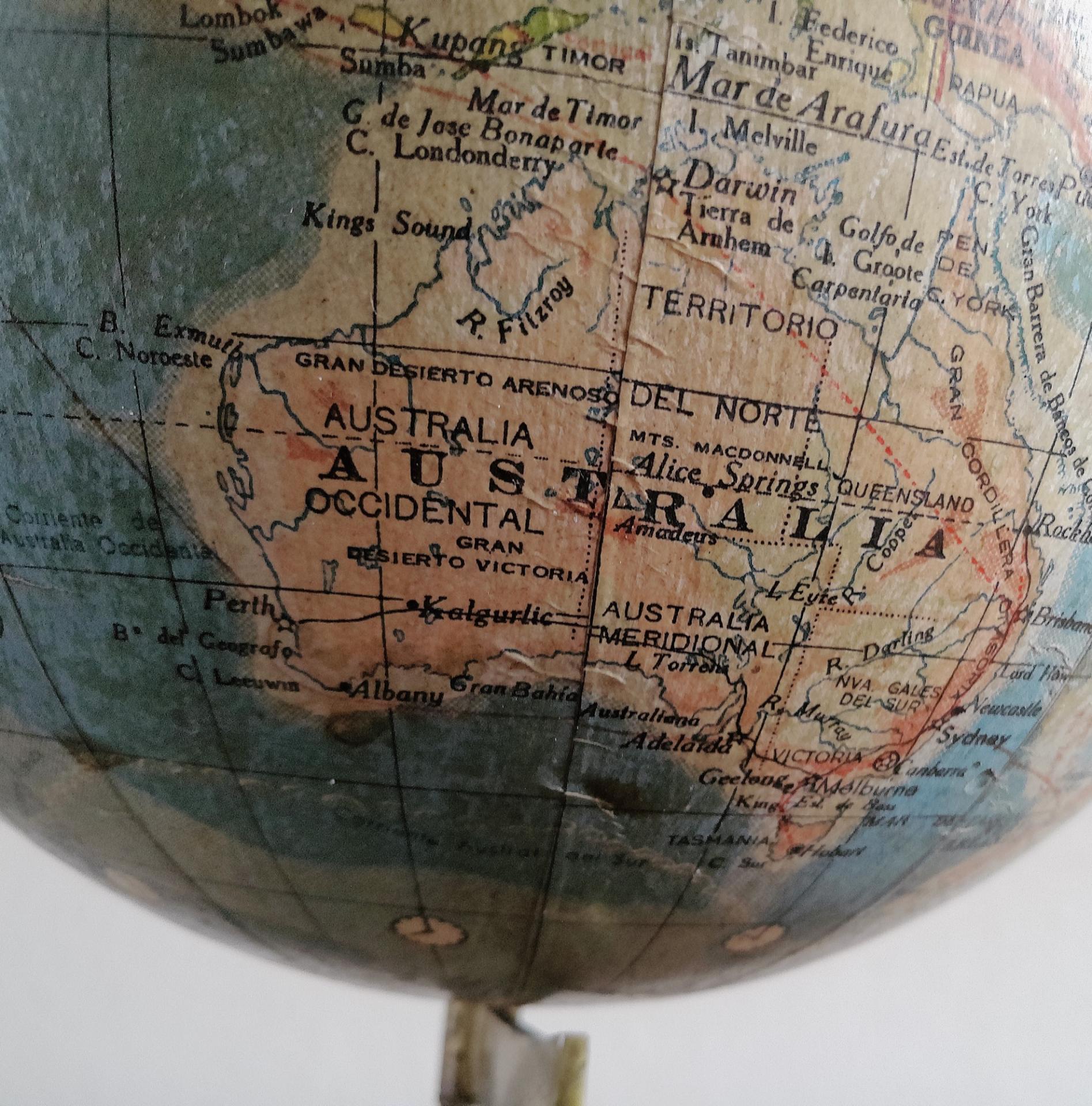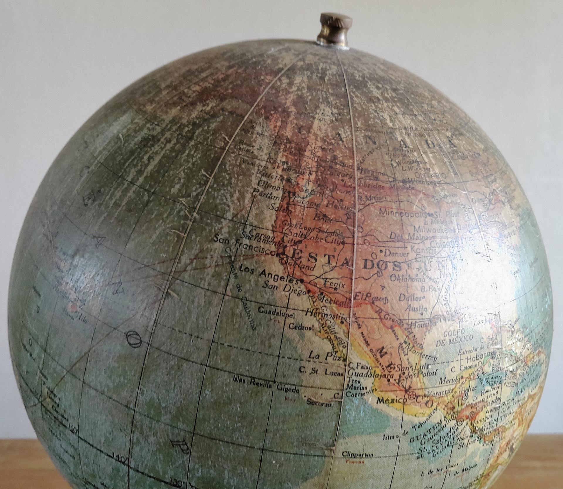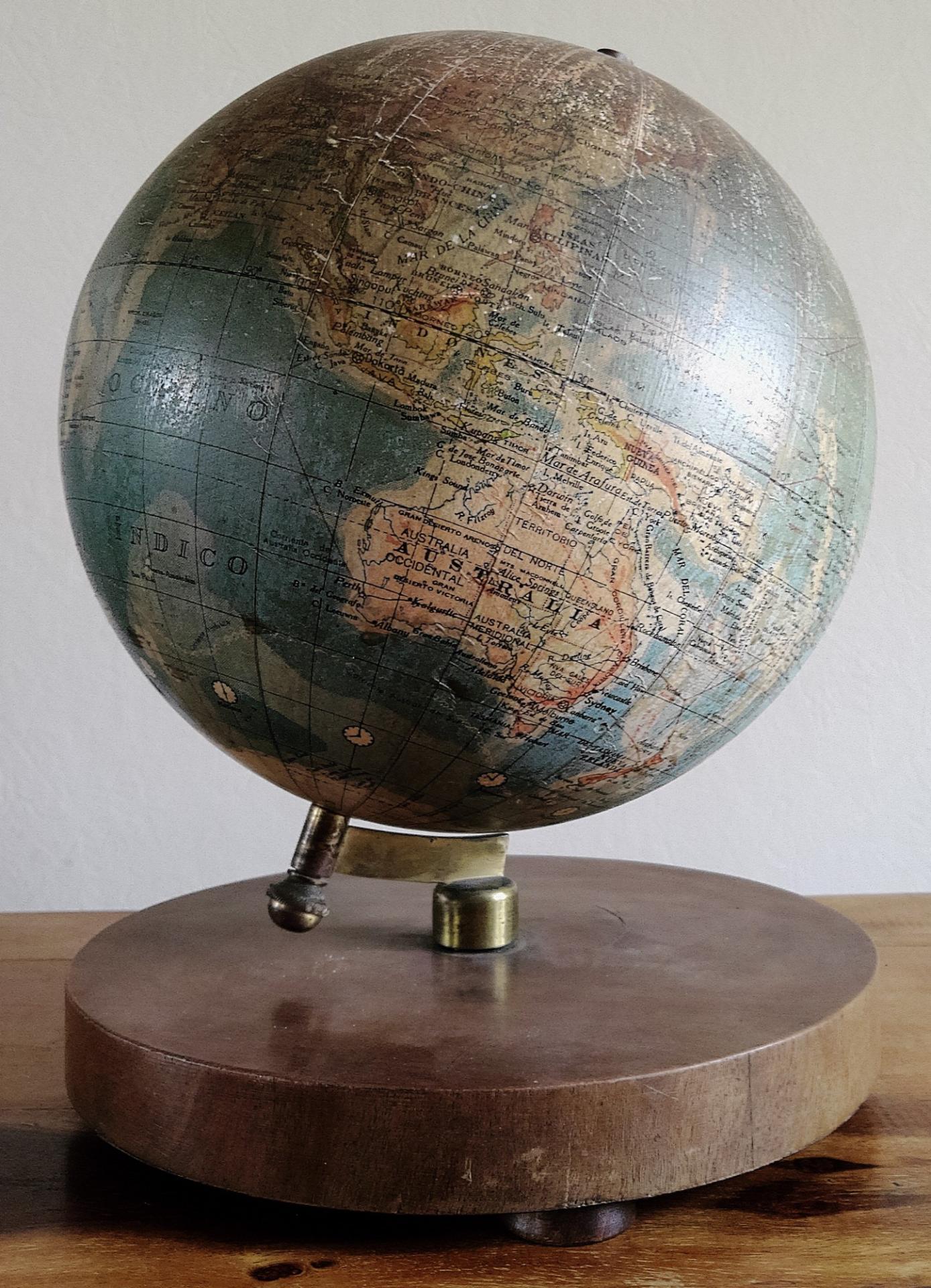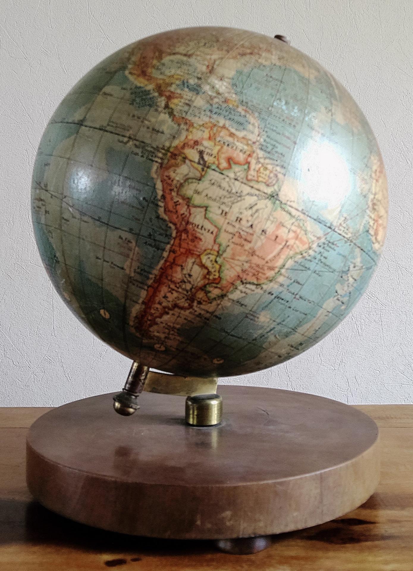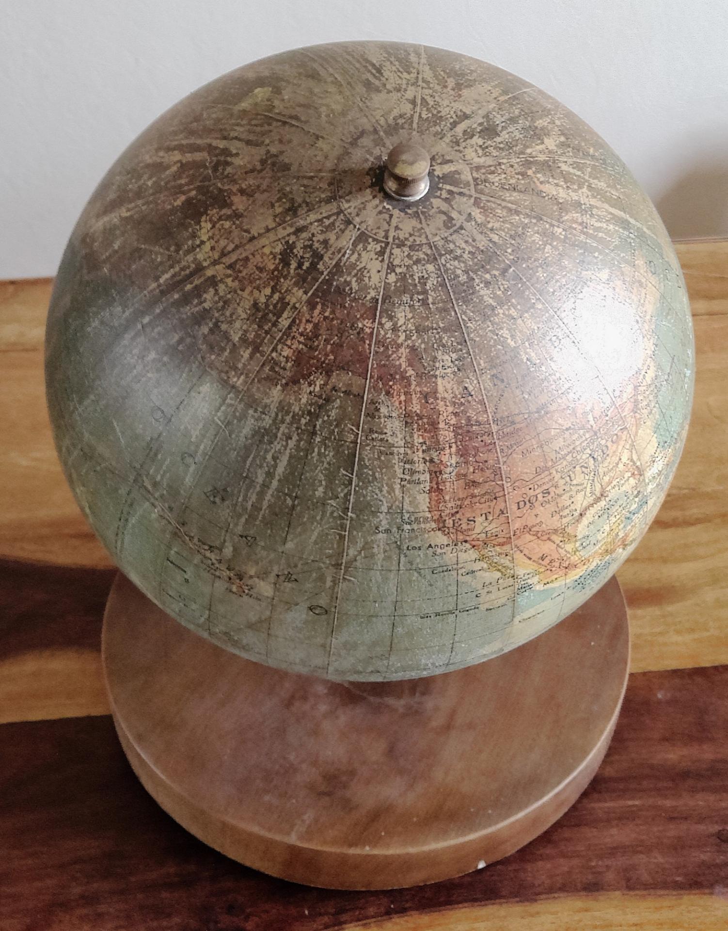 Globe terrestre ancien avec base en bois par Paluzie pour Antonio Santamáns Barcelona vers 1910-1930