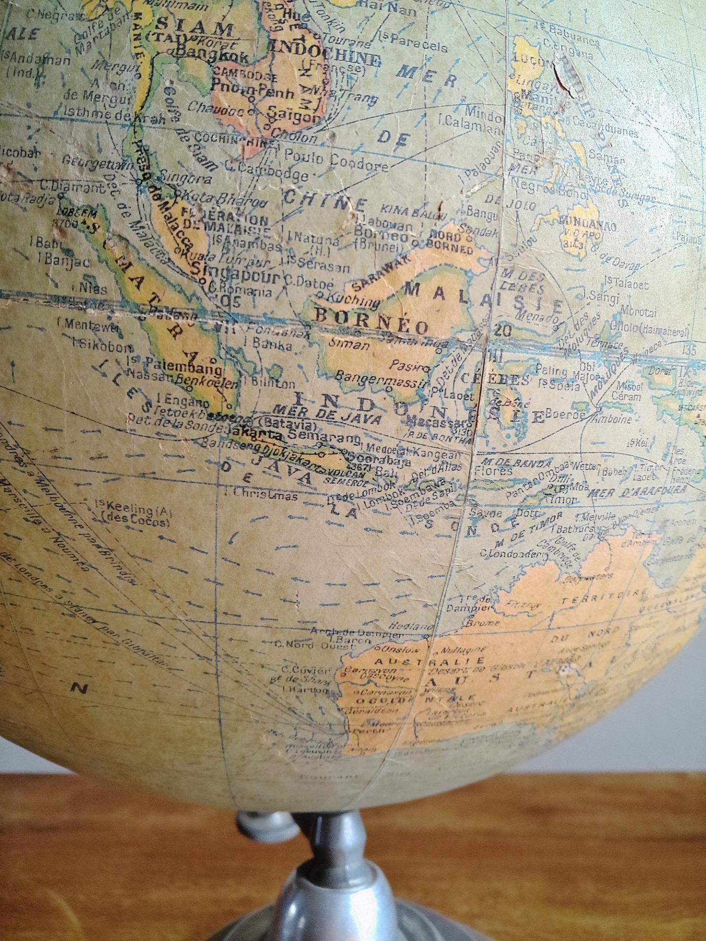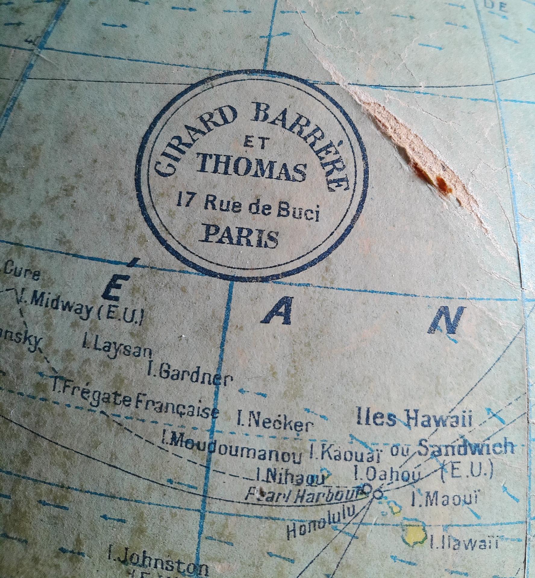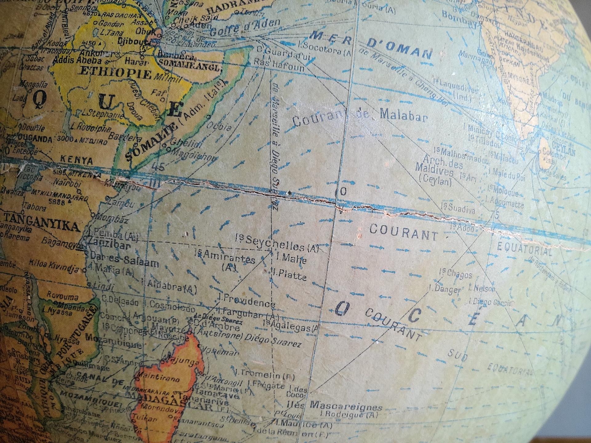 Globe terrestre Girard, Barrère et Thomas datant d'entre 1948 et 1951. Israël figure sur le globe et le Mozambique s'appelle Afrique orientale Portugaise, nom utilisé par les cartographes jusqu'en 1951.