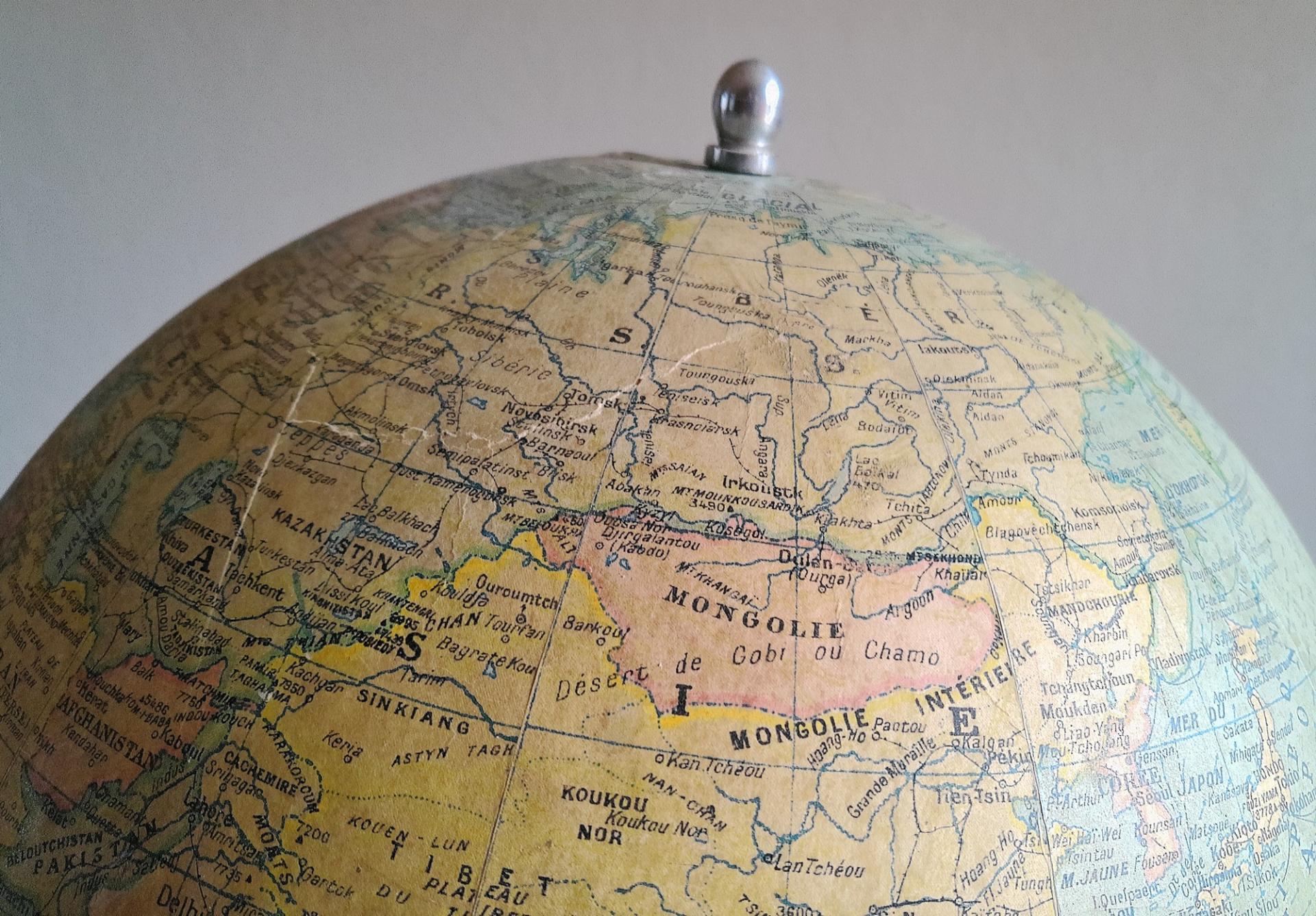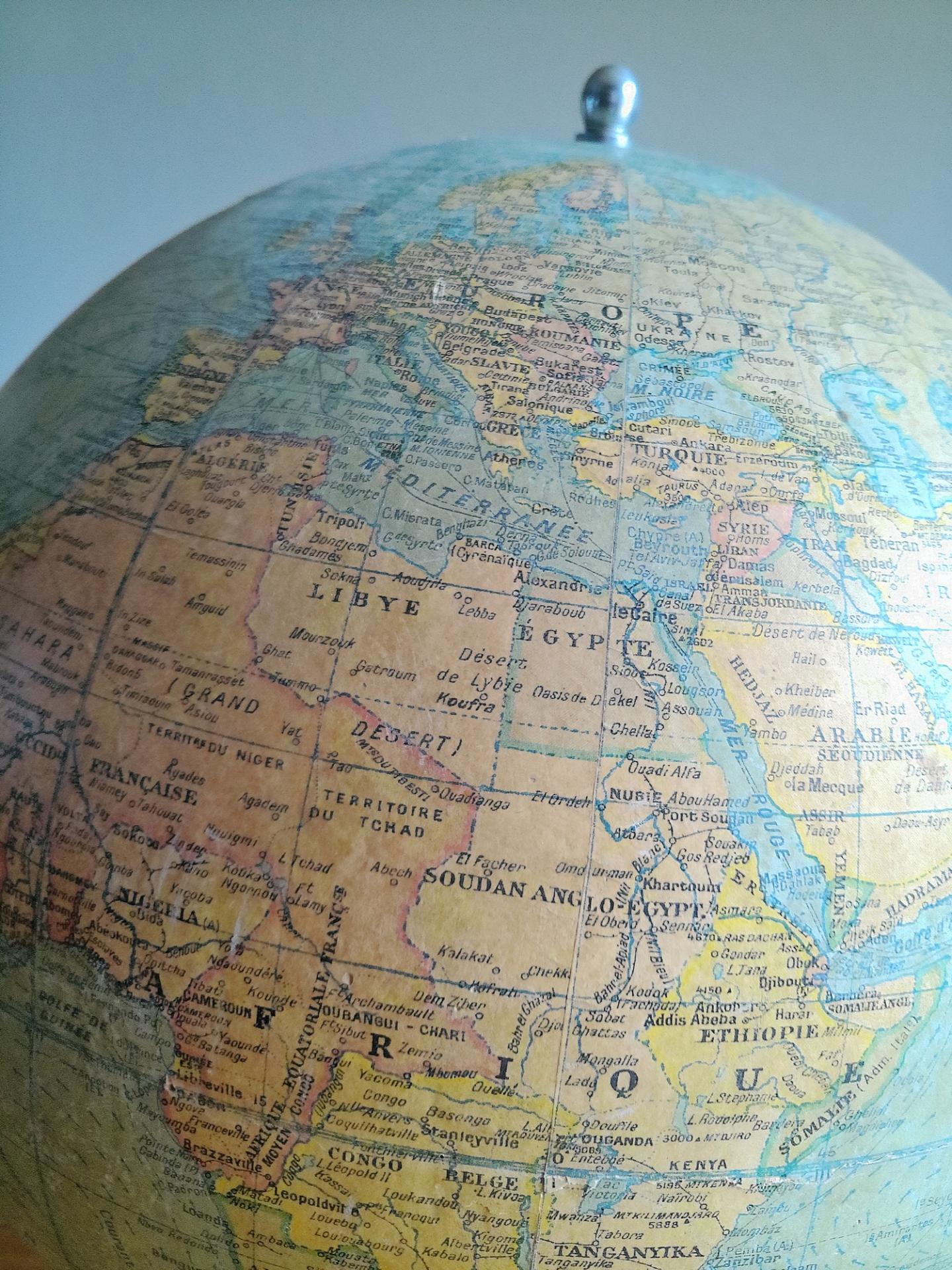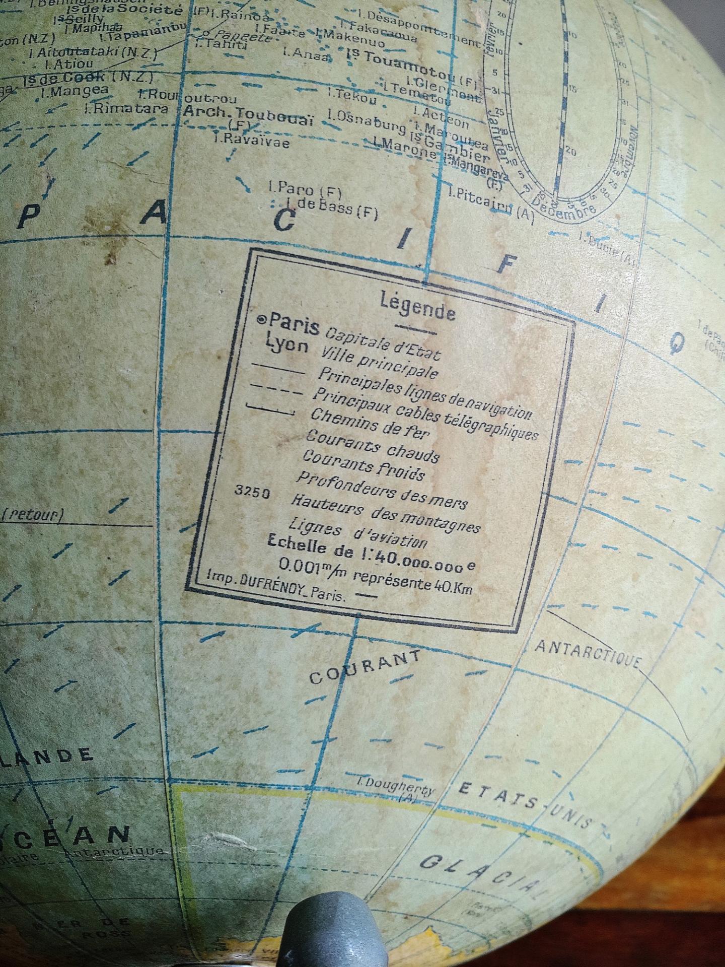 Globe terrestre Girard, Barrère et Thomas datant d'entre 1948 et 1951. Israël figure sur le globe et le Mozambique s'appelle Afrique orientale Portugaise, nom utilisé par les cartographes jusqu'en 1951.
